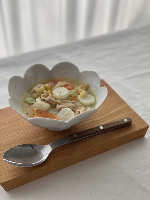 닭가슴살, 각종 야채, 마, 마카로니 넣고 물넣고 치킨스톡, 버터 넣고 막 끓이세요. 요거야 말로 영양 가득한 한그릇 식단!