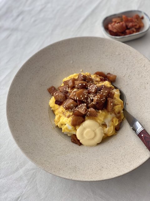 익힌 통마늘과 마, 가지의 식감이 뭉근하니 잘어울리는 덮밥이에요. 고추장, 간장, 참치액으로 간을 맞춰 한그릇 해치웠어요.