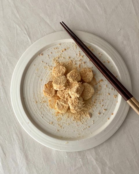 생으로 먹어도 맛있는데 끈적임 살짝 거슬리시면 - 마를 콩가루에 굴려서 먹으면 칼로리도 낮고 건강에도 좋은 마절미에요. 콩가루 많이요 -