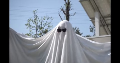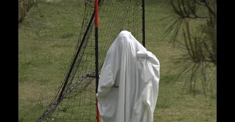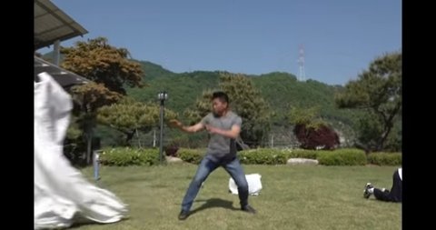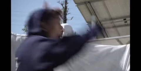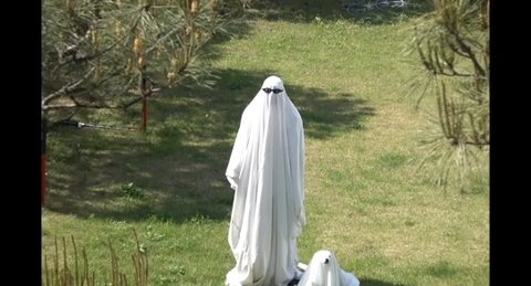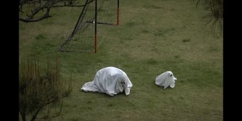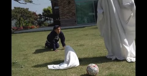 시작부터 천떼기 뒤집어 쓴 이상한 사람과 개 등장