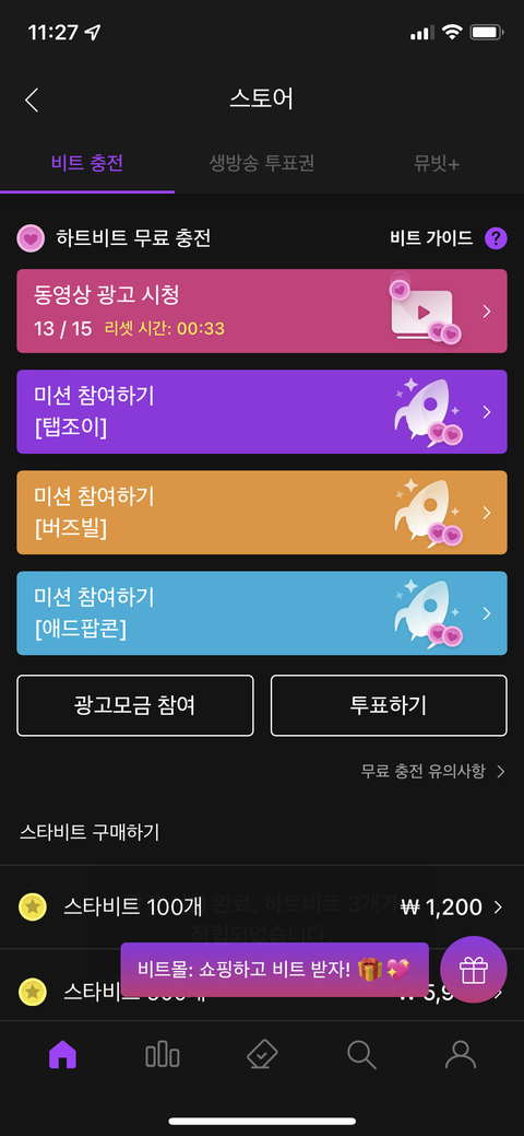뮤빗 음중투표 무료 충전해~