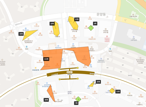 - 운양역 기준으로, 좌측은 프렌차이즈 상권(스타벅스, 올리브영, 음식점 프렌차이즈 등등) 및 중형마트 3곳 있습니다.
