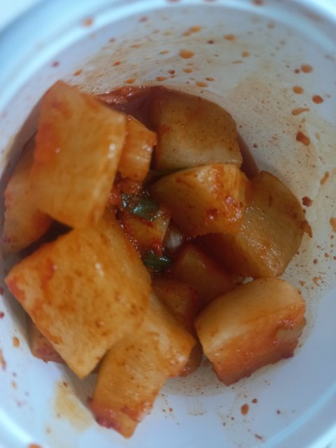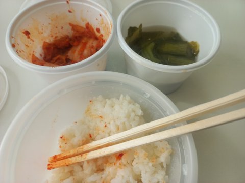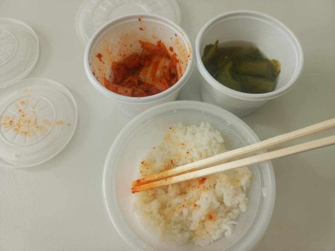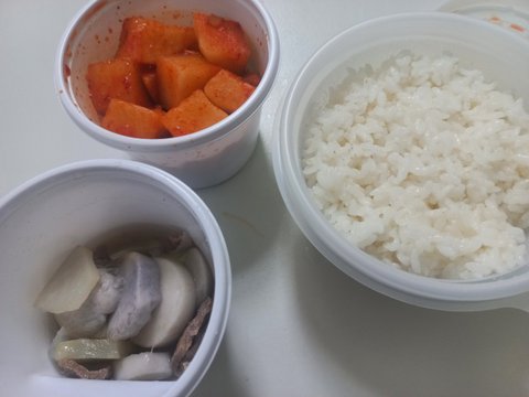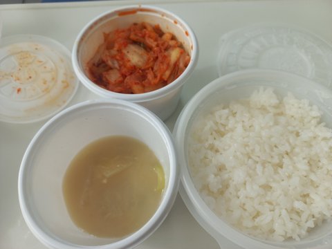 반찬통에 담은 식은 국에, 김치 쪼가리 반찬...