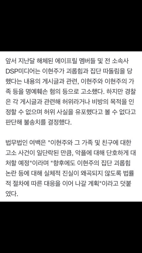 앞서 에이프릴과 DSP미디어는 이현주가 괴롭힘과 집단 따돌림을 당했다는 내용의 게시글과 관련, 이현주와 이현주의 가족 등을 명예훼손 혐의 등으로 고소한 바 있다.