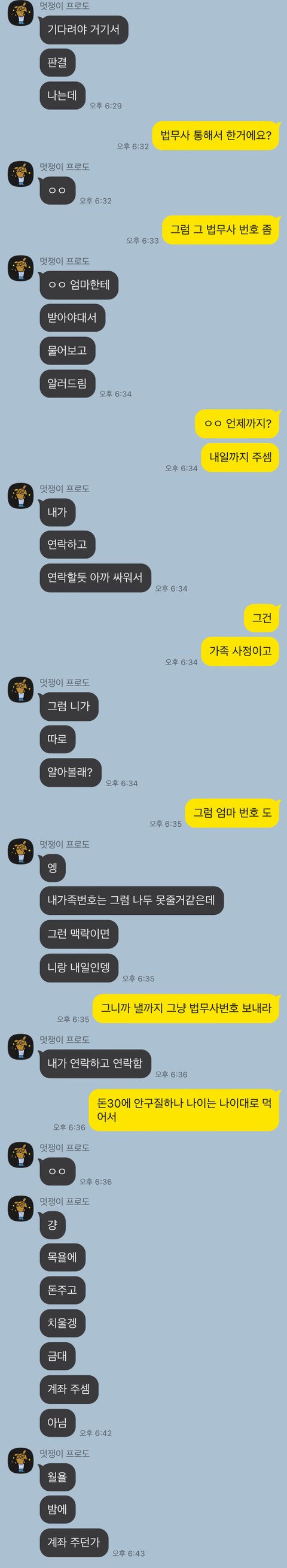 하지만 연락을 하면 아직 서류가 안 왔다며 회생이 진행되는지에 대한 확답을 주지 못해 그럼 안되는 경우는 생각을 해봤냐 남은 돈을 어떻게 책임을 질 거냐 했더니 회생이 되니깐 법무사에서 3개월 뒤에 오라고 한 거고 회생이 안되는 경우를 생각해 본 적 없다고 합니다.이쯤 되니 회생은 변명이고 시간만 끄는 거 같아 진행 중인 법무사 전화번호를 요구했으나 또 변명을 하며 본인이 확인해서 주겠다는 말에 더 이상 신뢰를 할 수 없다 생각하여 안 구질하냐라고 했습니다. 그 주에 15만원을 입금해 주고 남은 20만원은 다음 달에 준다고 연락 오더군요.ㅋㅋ