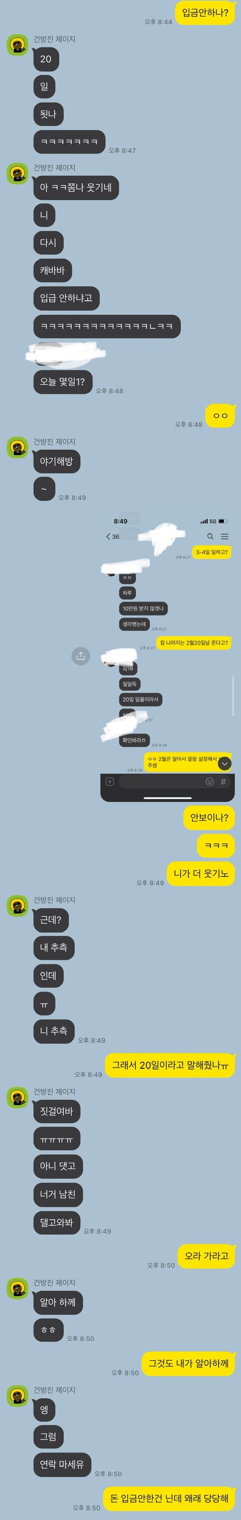 당연히 사람이기 때문에 미안하다는 태도를 보일 때도 있었지만 제가 느낀 태도는 "내가 너한테 돈을 빌린 건 맞지만 내가 입금 약속을 못 지킨 건 정당한 이유가 있다. 근데 돈은 언제 입금될지 모르겠다. 그러니 내가 돈을 받을 때까지 기다려."로 느껴졌습니다.