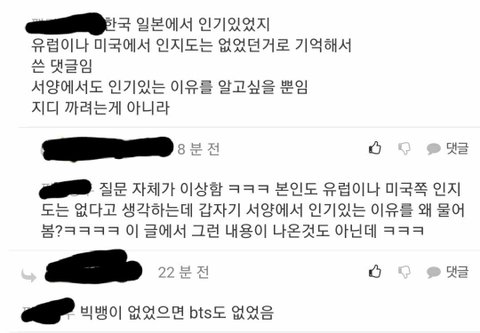 심지어 빅뱅 없었으면 방탄도 없었다는 이런 댓글 아무렇지 않게 쓰는데 자기들 후배들한테 안하는 집착을 방탄한테만...