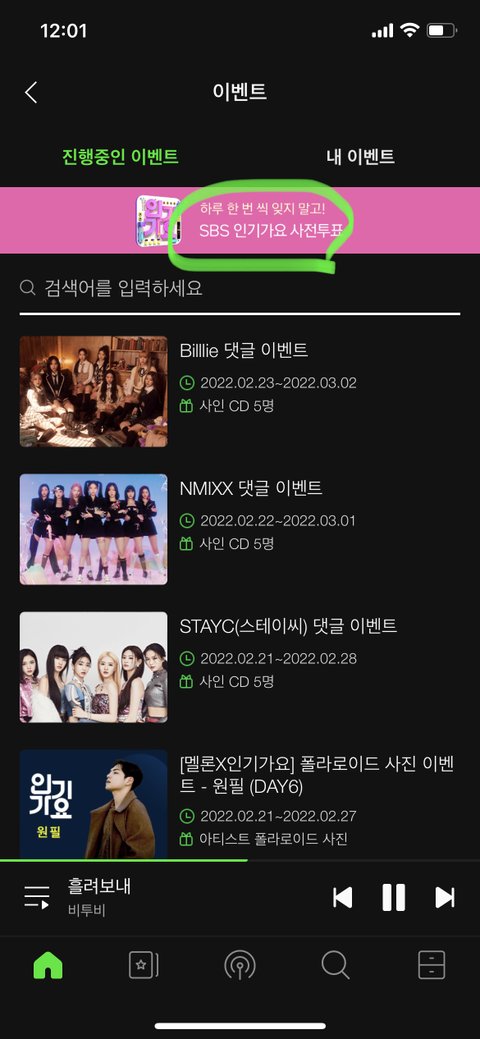 이벤트 > 인기가요 사전투표 > 경쟁력 낮은 노래2곡과 비투비 노래 총 3곡 투표 !!