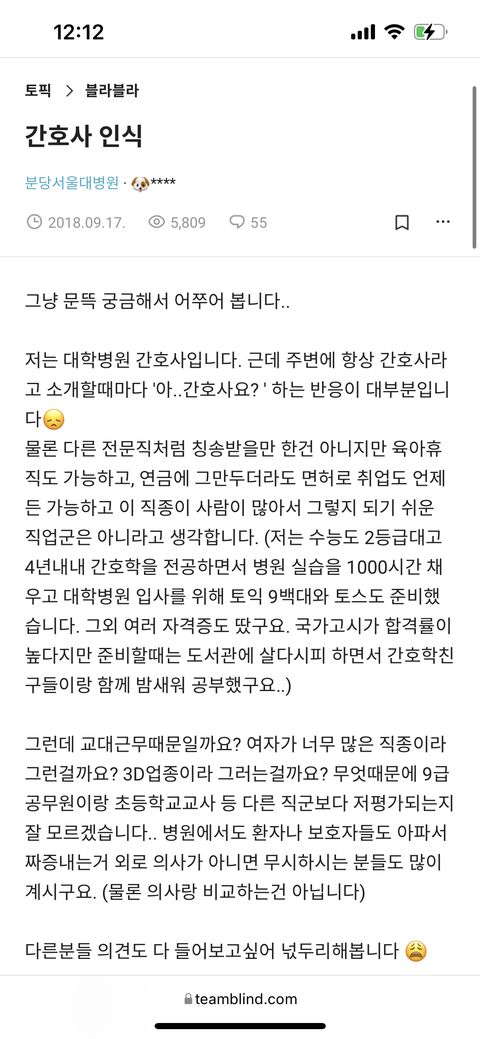 간호사 인식이 낮은 이유는 젤 큰게 진입장벽이 낮은거....입시나 그런거 그리고 간호사 코스프레 복장 그런것도 있고.. 게다가 간호조무사들이 클럽 나이트 이런데가서 간호사 사칭하며 다니는 것도 있고... 게다가 태움 문화도 한 몫하고 3D에 3교대에 근속연수 짧은 것도 한 몫하고... 근데 간호사가 교사보다 훨씬 돈 잘 벌고(메이저 대학병원 기준) 간호직 공무원으로 갈 수 있고 간호 장교도 할 수 있고.. 제약회사도 갈 수 있고... 심지어 시골가서도 취업할 수 있는게 간호사인데.. 사실 이런거는 간호사 출신이거나 나처럼 다양한 직업에 관심 많은 애들이나 알고 있는거지.. 웬만한 사람들의 간호사 이미지는 앞서 말한 것과 같음.