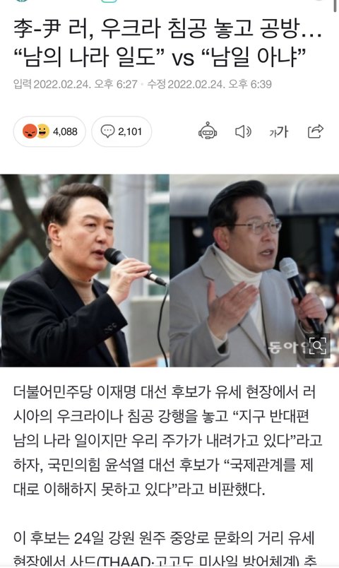 이재명은 남의 나라일이지만 우리에게까지 영향을 준다고 말한거다. 앞뒤 다자르고 선동 잘하네? 그리고 이재명은 한미동맹 강화한다 했음. 트럼프 시절 미군 방위금 5배로 올려달라하니 어차피 철수도 못하니 다줄필요 없다고 한것 뿐. 외신에선 윤석열 안보관 보고 오히려 무지하다 위험하다 난리다ㅋ
