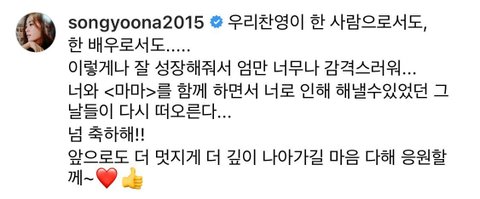 윤찬영이 <지우학> 잘되고 올라온 송윤아의 축하글