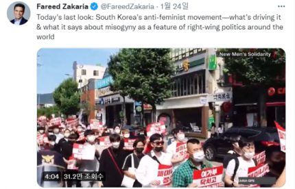 당시 매체는 '워싱턴 포스트' 칼럼리스트인 파리드 자카리아가 진행한 '한국의 놀라운 안티페미니즘 운동' 방송에서 "한국 젊은이들 사이에서 남성의 권리를 신장해야 한다는 운동이 나오고 있다. 이 운동은 온라인에서 힘을 얻고 우파 정치인들의 기회주의적인 구애를 받으며 커지고 있다"고 보도했다.
