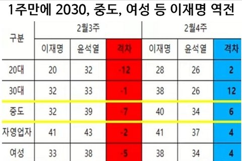 3주차 여론조사에서 2030여성, 중도층 이재명 지지율 급상승