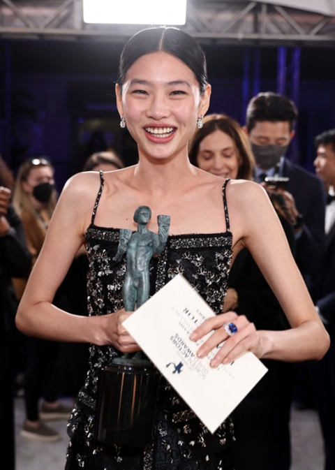 정호연은 “우선 감사하다. 여기 계신 많은 배우 분들을 관객으로 TV에서 스크린으로 봤는데, 그분들을 보면서 배우가 되고 싶다는 꿈을 꿨다. 지금 이 자리에 있다는 것 자체가 영광이고 감사하다”며 눈물을 보였다. 이어 정호연은 ‘오징어게임’ 황동혁 감독과 배우들의 이름을 부르며 “아이 러브 유(I LOVE YOU)”라고 말함