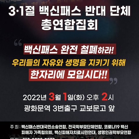 또한 3.1일 이동욱 회장님이 주최하는 백신패스 반대 집회에 많은 분들이 참여하여, 새로운 정부에 대해 여러분의 목소리를 내 주시기 바랍니다.