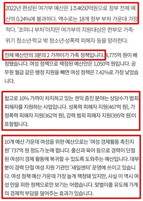 +여가부 예산 정부부처중 가장적고 가족,아동,청소년 사업+성범죄 피해자 여성(위안부 할머님들 포함), 경력단절여성 지원함 여가부 악마화해서 없앤다고 남자가 잘살게 되는거아님ㅋ