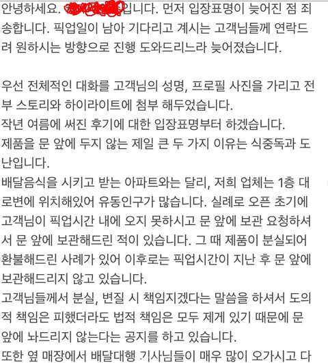 개소리를 맞는소리마냥 잘 늘어놨는데 약속이 늦은 고객의 탓으로 돌리려고 하는건 알겠지만 그러면 약속을 늦은 탓도 있으니 혹여나 가게앞에 내놓았다고 해도 설사 일어날수 있는 도난의 문제는 고객의 책임이 될수밖에 없겠죠.솔직히 저런상황에서 앞에 놔두고 갔는데 고객이 식중독이 걸려서 환불을 요청한다. 혹은 도난을 당해서 환불을 요청했다 하면