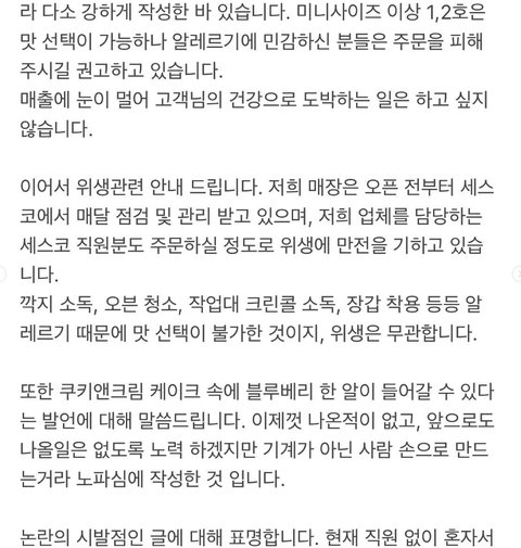 또는 동일한 작업대에서 작업하므로 쿠앤크 수제케이크에서 블로베리가 나와도환불 불가.