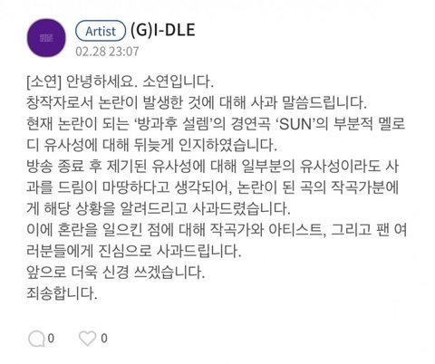 요약- 방송작후, 음원발매 전, 유사성 인지-> 아티스트(전소연으로 추정)가 해당작곡가에게 직접 사과