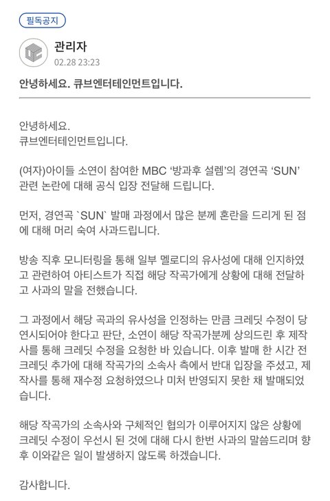 -> 큐브는 협의 하지 않고 정보수정이 우선시 된 점에대에 사과