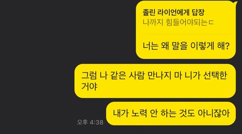이 부분에 화가난 여자는 '너는 왜 말을 그렇게 해? 그럼 나 같은 사람 만나지 마 니가 선택한 거야 내가 노력 안 한 것도 아니잖아' 라고 말했어