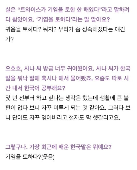 인터뷰하는 분도 사나에게 한국어가 제2외국어인 걸 깜박하신 듯ㅋㅋㅋㅋㅋ