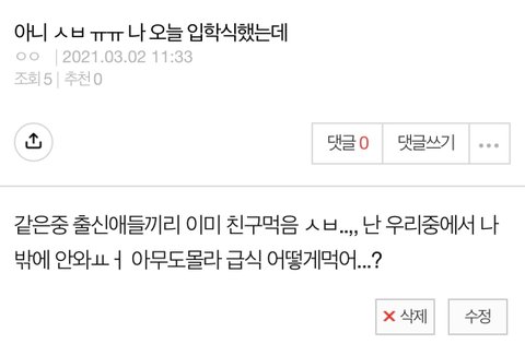 나도 새학기에 이런 글 올리고, 학교 갔다와서 울고 엄마한테 신세한탄하고, 중학교 때 친구들한테 맨날 울면서 전화했었는데 4월만 되니까 친구들도 엄청 많이 생기고 ㅋㅋㅋ