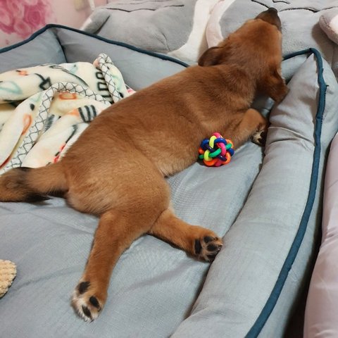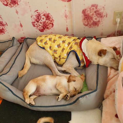 산책가려고 옷입은 엄마 옆에 파랑이가 곤히 잠들었네요.
