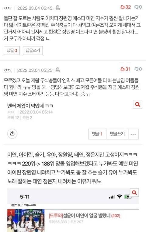 근데 왜 맨날 새 여돌 나올때마다 죄다 장원영이랑 vs 글 올림? 지들이 보기에도 장원영이 잘나가긴 하나봄 ㅋㅋㅋ