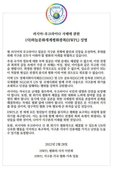 HWPL, “러, 군대 철수” 성명서 발표