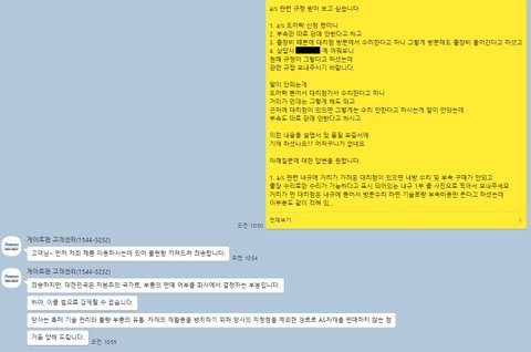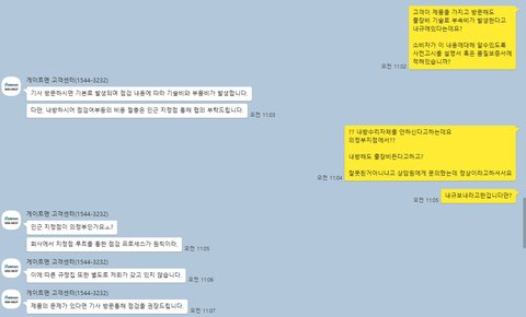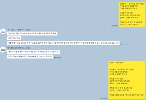 대리점이 근처에 없으면 기술료+ 부속비를 받는다는 말인데 말이 되는건지 답답하여 통화 종료후 게이트맨 본사 카카오톡 고객센터 상담실에내규를 보여달라 요청하였습니다. 그 대화내용은 캡쳐해서 아래 올리도록 하겠습니다.