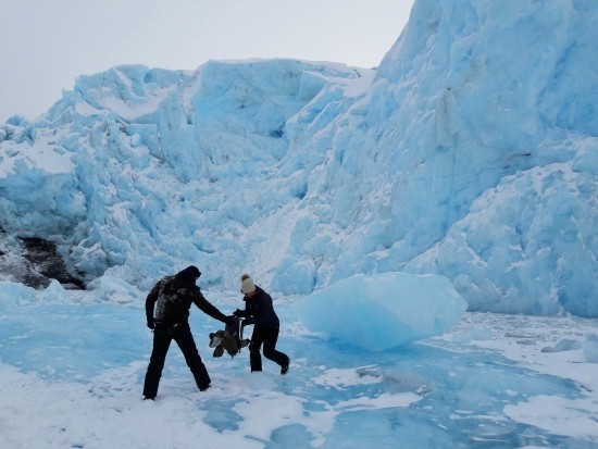 호수가 얼어붙어 그 위를 한참이나 걸어서 만난 빙하인데