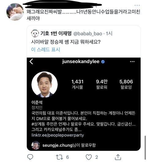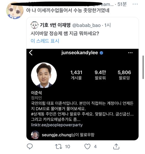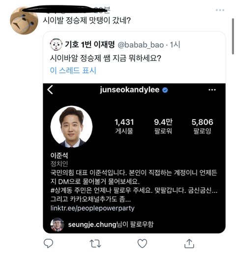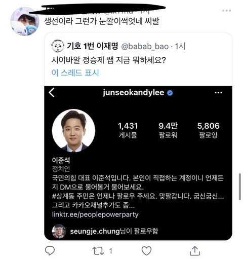 고작 정승제가 이준석 인스타 팔로우 했다고 말하는거 봐…적당히가 없음 선 조카 넘어 정승제 이준석만 팔로우 하는 거 아니고 이재용 팬페이지(ㄹㅇ 왜…?)랑 이낙연도 팔로우함 지들 본진 사진 달고 그러고 싶나 내가 다 쪽팔림