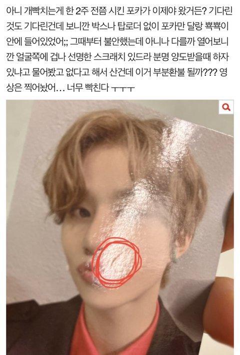 어제 이 글 쓴 사람인데…보니깐 뒷면에도 기스 있더라 ㅋㅋ 결국 부분환불이라도 해달라고 개봉영상까지 보냈는데 자기가 거래하면서 이런 경우는 처음이고 처음 받았을때 바로 오피피에 넣어둔거라 하자가 생긴게 납득이 안간다는 말만 반복해 사과도 한마디 없고… 분명 거래할때 하자 있냐고 물어봤고 없다고 해서 거래한거란 말이야;; 결론은 자기는 하자 생긴게 납득이 안되니깐 환불 못해준대 ㅆㅂ 납득이 안가는건 난데