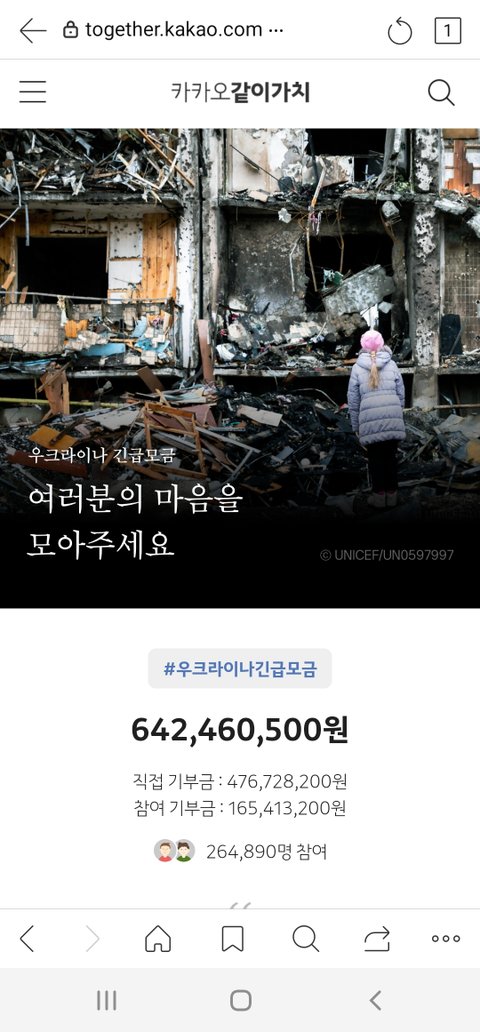 지금, 우크라이나를 위해 여러분의 마음을 모아주세요. 모금함을 통해 기부에 참여하실 수 있습니다. 여러분이 댓글을 남겨주시면 카카오가 1,000원을 우크라이나 긴급구호를 위해 기부합니다.
