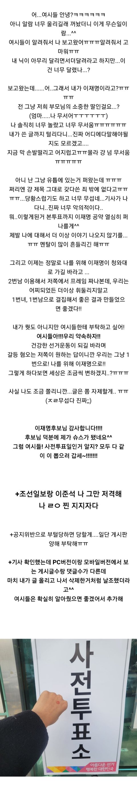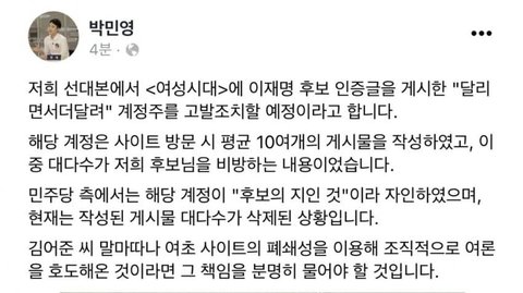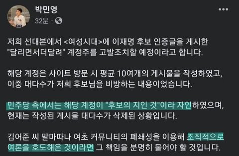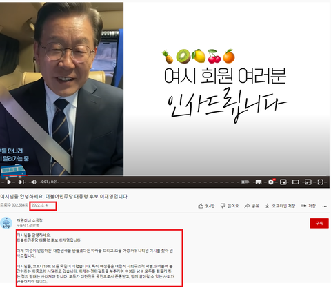 사건의 발단은 이재명이 유튜브에 여성시대에 인사하는 유튜브를 올렸고, 그걸 본 여시 회원이 맨 첫번째로 여시에 영상을 퍼왔어