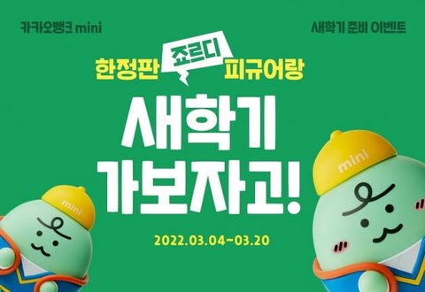 mini 새학기 이벤트는 기간 내 mini카드로 온·오프라인 결제 2회와 mini를 이용한 계좌·간편이체 2회, 총 4회의 미션을 달성하면 추첨을 통해 5000명에게 죠르디 피규어를 증정한다. 죠르디 피규어는 카카오뱅크가 직접 제작한 한정판 상품이며, 저금통으로 사용할 수도 있다. 이벤트 기간은 3월20일까지다.
