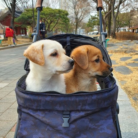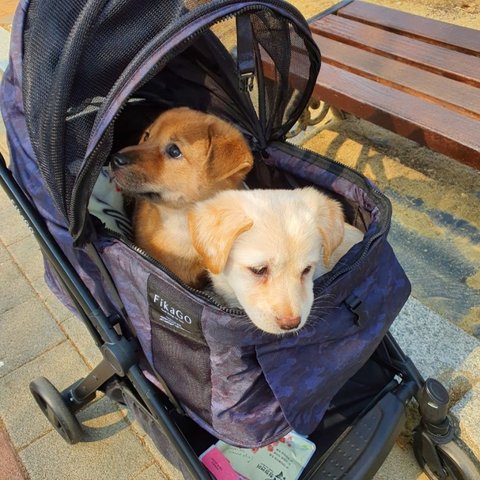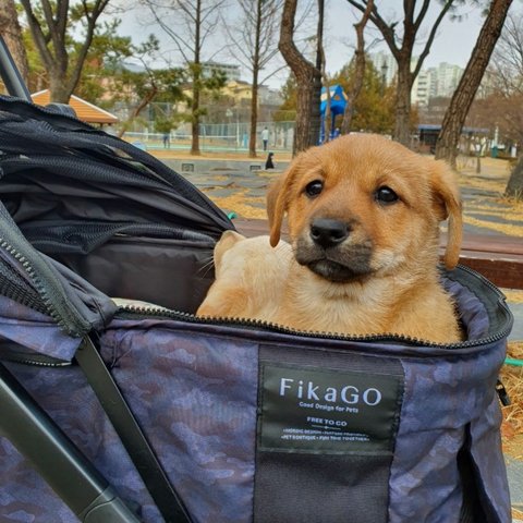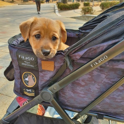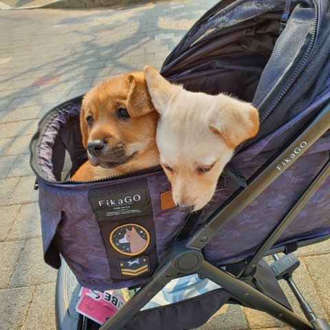유모차에 태워서 바깥공기 맡고 집이 아닌 다른 사물, 사람, 동물 구경을 시켜줬어요.