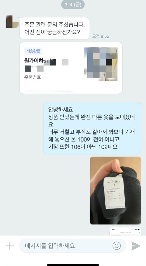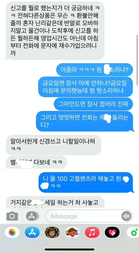 처음엔 예의를 지켰지만 판매자의 태도에 화가나 흥분해버렸는데 욕설들은 가리고 톡톡, 문자내용 모두 첨부합니다.