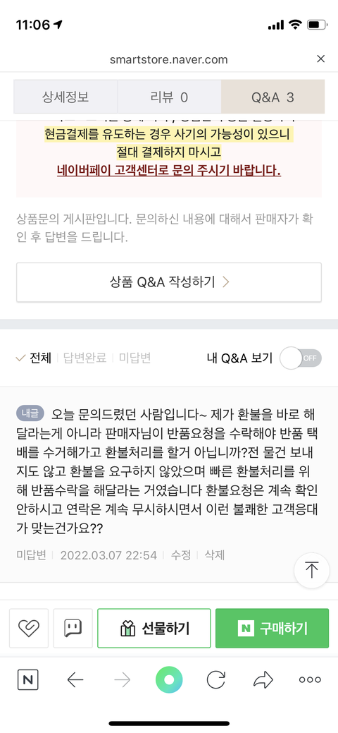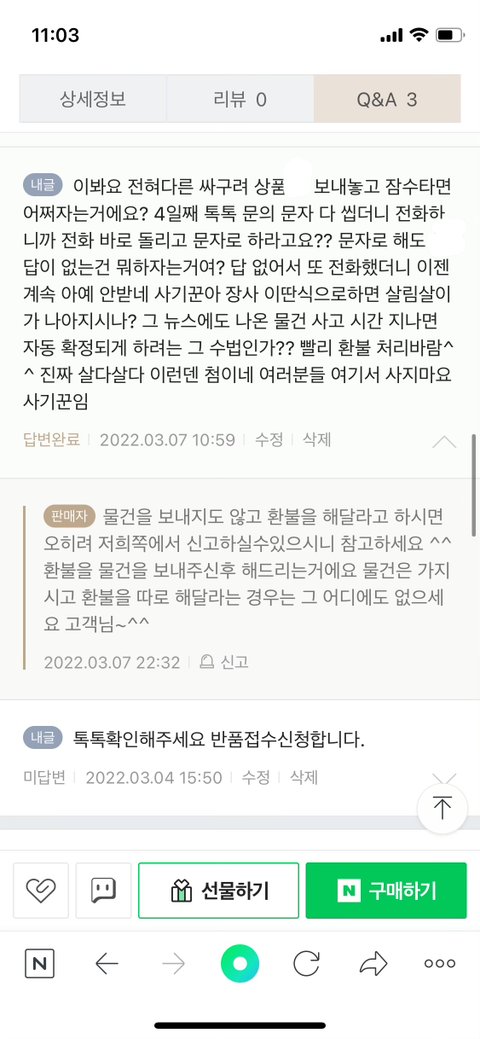 3월 4일 금요일 오전 10시에 톡톡으로 판매자에게 인사까지 하며 정중히 문의를 했으나 답이 없어, 톡톡은 잘 안보나싶어서 상품 문의하기에도 문의를 했지만 역시 답은 없었습니다.