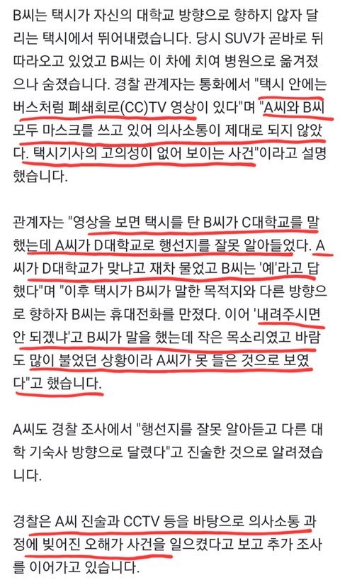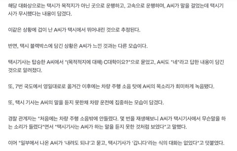 여대생 술마시고 탐.(경찰 조사 결과 술 안 마셨다고 해요. 이 부분 수정합니다. 죄송합니다) 남친이 잡아준 택시. 기사님이 같이 짐도 실어줌. 행선지 대화함. ㅇㅇ대요. ㅁㅁ대요? 네. (서로 다른 대학 불렀고, 행선지 못 알아들음) 대화 후 얼마 지나지 않아 불안하다고 지인한테 톡, 남친에게 전화. 창문 열린 자동차 전용도로라 블박에 바깥 차소리 다 들릴 정도로 소음이 컸다고 함. 그 후 여대생이 작은 소리로 세워 달라고 함. 계속 남친과 통화 중이다 물은 거라 자기한테 묻는 줄 모름. 거기다 창문이 열려 있어 시끄러웠고 여대생은 웅얼거리며 말함.(경찰도 블박 몇 번이나 돌려본 후에야 겨우 들었다고 함) 대답 없자 뛰어내림.(일부에서 말하는 '갑니다'는 아예 없었다고 경찰이 발표함) 택시 탄 지 3분도 안 되어서 벌어진 일들임.(동생이 처음에 분명 3분이라 올림. 이후 글 수정함) ╋ 괄호 부분은 뒤에 덧붙인 것임.