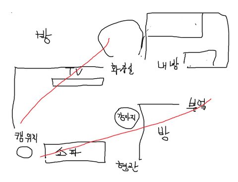1) 강아지가 노견이고, 가족들이 외출한 이후, 강아지가 걱정되어 집에 캠을 설치 (문제 : 가족 중에 나만 모름. 앵글상 거실이 1/2, 제 방과 화장실이 각각 1/4씩 보임. )