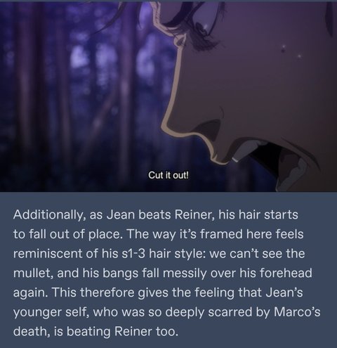 쟝이 라이너 뚜까 패면서 정리된 머리가 흐트러지고 앞머리도 막 삐져나오는데 딱 이 장면이 쟝 긴머리 가리고 있어서 1-3기 15살 때의 쟝처럼 보이게 만듦. 그래서 마르코의 죽음으로 깊은 상처 받은 어릴 때의 쟝이 라이너 패고 있는 느낌도 줌….