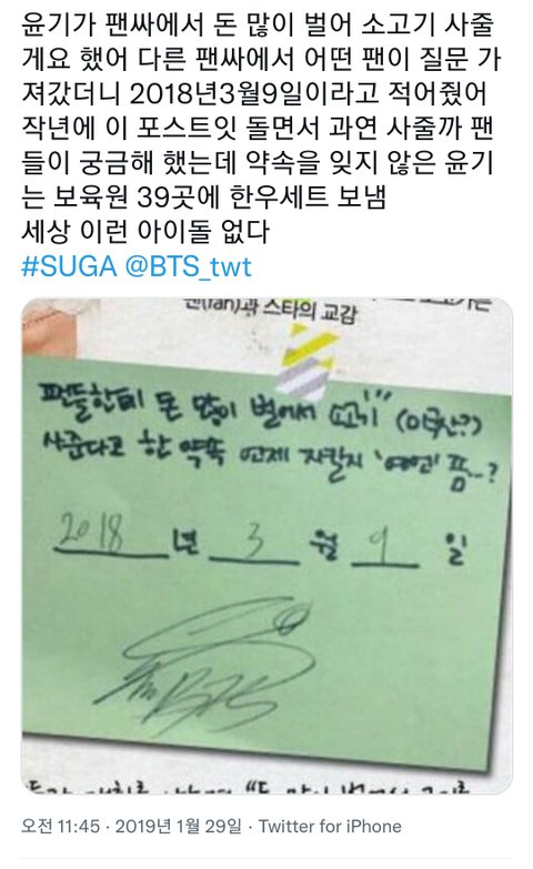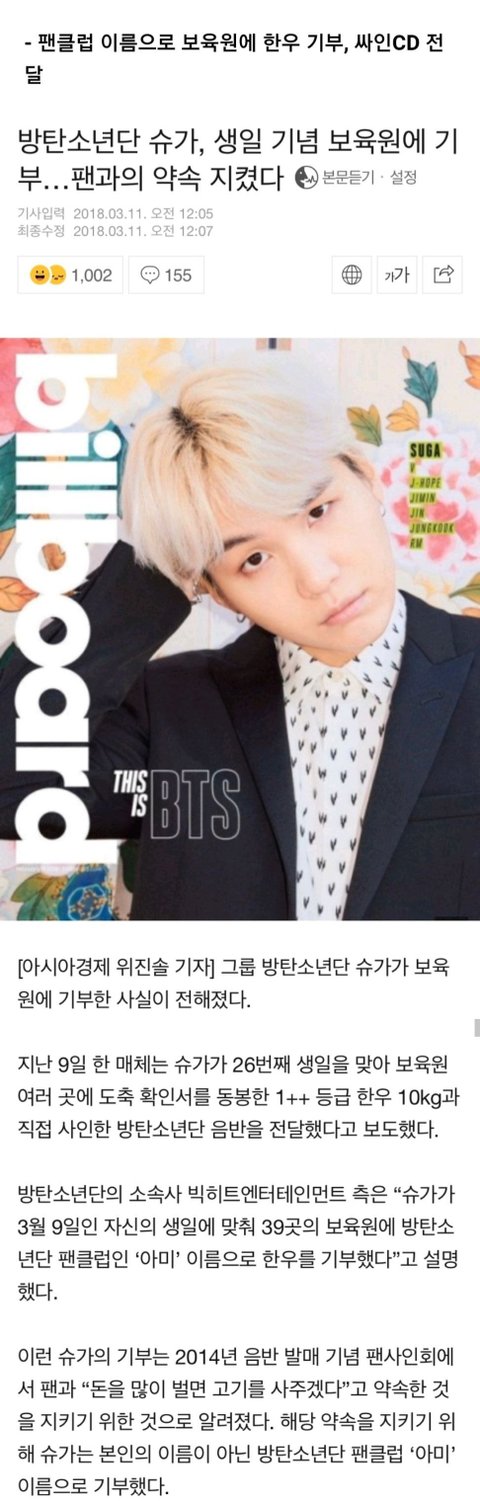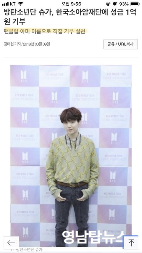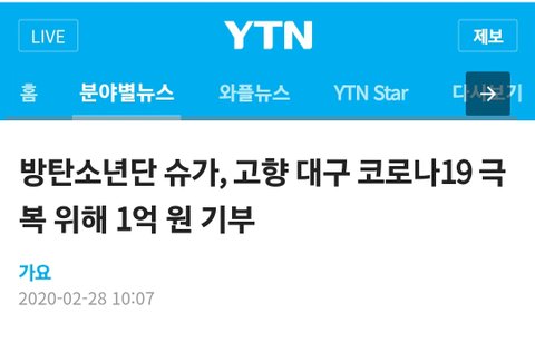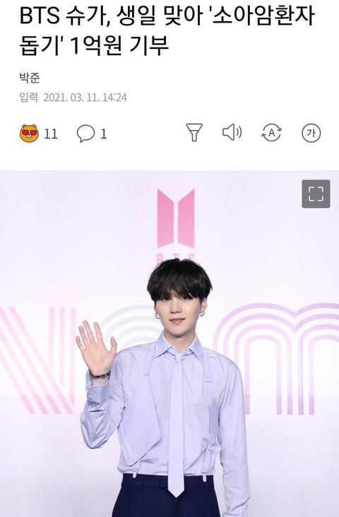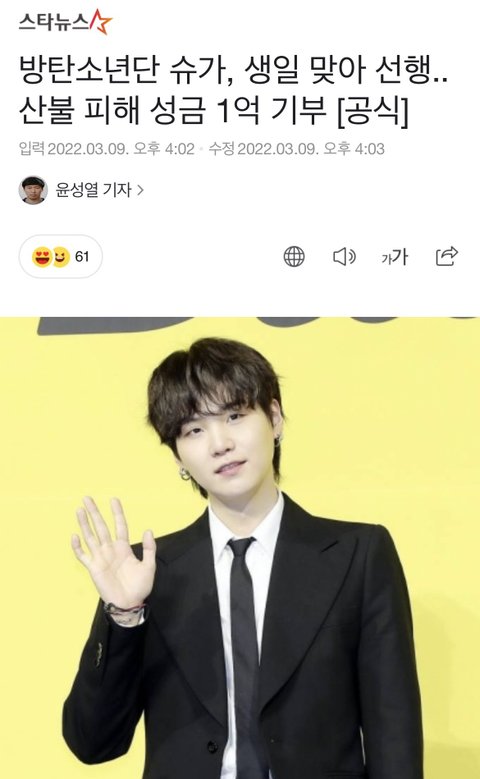 3월 9일 본인의 생일을 맞아 산불이 난 지역 주민들을 위해 1억원 기부한 방탄 슈가