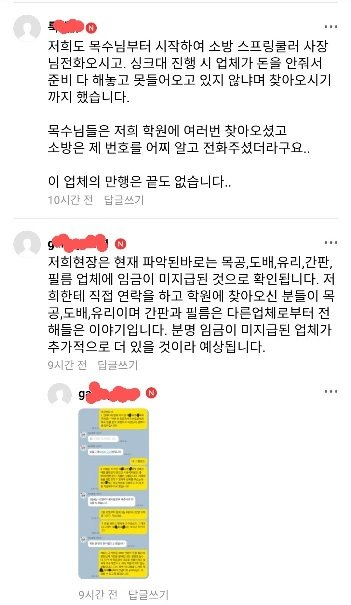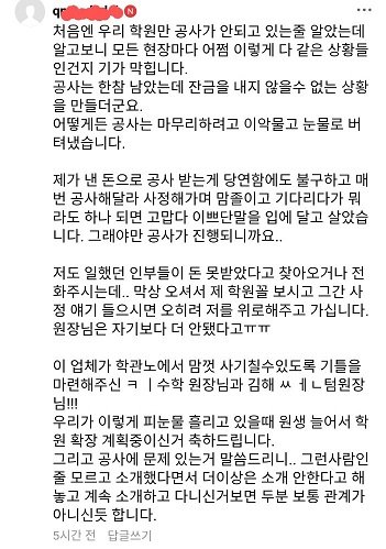 사건의 발단은 이렇습니다. 까페 내 동종 업계에 종사하는 김해 ㅇㅇ 학원 원장이 직접 성의 있게 작성한 인테리어 후기 글을 보고 해당 악질 업자를 쪽지를 통해 추천 받았습니다. 학관ㅇ 까페는 학원장들이 주로 모인 관계로 강한 유대감과 신뢰감이 있습니다. 따라서 인테리어 후기 글은 어떤 의심도 할 수 없었으며 저를 비롯한 수십명의 학원 원장들이 피해자가 된 것입니다.
