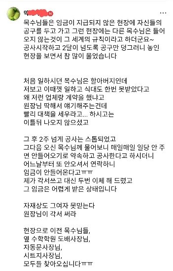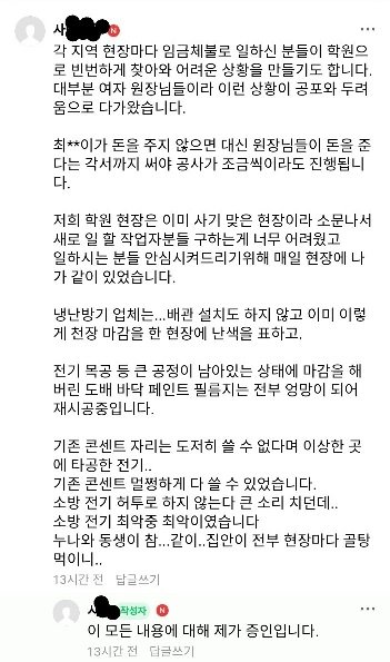 27만명의 학원 원장님들이 가입되어 있는 학관*라는 카페가 있습니다. 그곳에 많은 이슈가 되고 있는 일 중 하나이며, 그 이슈는 바로 악질 40대 여자 인테리어 사기꾼 이야기입니다. 해당 업자는 수십 명의 인테리어 공사를 건설 면허도 없이 불법 수주하여, 상습 기망, 상습 임금 체불 및 엽기적인 자살 협박 쇼, 유서협박 쇼 그리고 고의적 계약기간 위반, 고의적 공사지연, 악랄한 추가금 요구 등 악질적 행태를 지속적으로 일삼고 있습니다. 해당 업자는 경우에 따라서 피해자 코스프레를 아주 능수능란하게 연기하며, 이 일에 엮인 분들은 해당 악질 업자의 행동에 하나같이 혀를 내두르고 있습니다. 많은 피해자가 심각한 금전적, 정신적 피해를 입고 있습니다. 저도 여기에 해당되는 피해자 중 한 명이며, 현재 해당 업자는 환불을 이행하라는 약속을 계속 지키지 않고 버티고 있습니다.