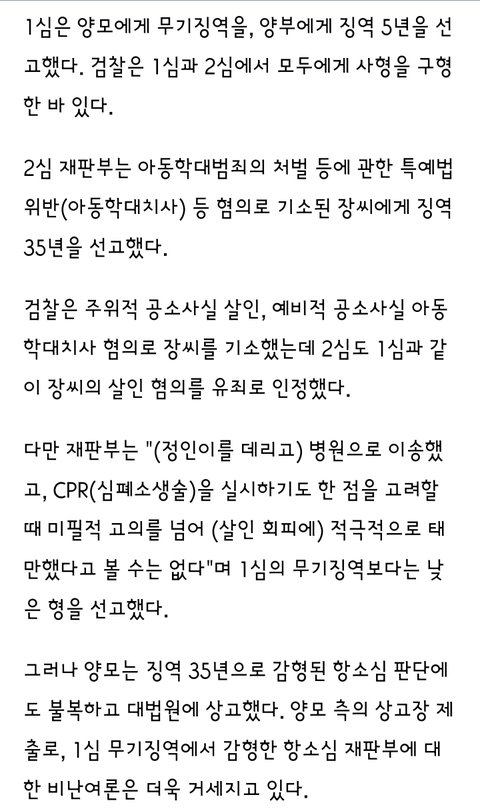 2심 재판부가 욕먹을거 각오하고 한건데 실상은 장씨 죄 1심보다 무겁게 다스린겁니다 우리나라 죄다 가석방되서 무기수 20년 이상 사는 사람 거의 없어요 차라리 35년형 구체적으로 때려박는게 훨씬 오래 수감됩니다