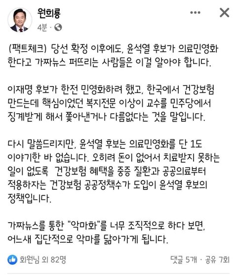 윤석열이 의료민영화 한다고 댓글쓰는 애들 다 페미 중국인임 네이버에 검색만 해봐도 윤석열은 공약에 의료민영화 이야기 한적도 없음 게다가 최저임금╋120시간도 거짓말임 갈라치기 하는 페미 조선족들 무시 ㄱㄱ