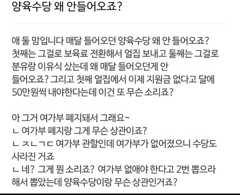 나도 애엄마인데요. 여가부를 없엔다는건 수천만원으로 화분사고 쓸데없는 시민 페미단체에 깜깜이 내 세금준다는거 없애고 아동 노인 장애인들을 위한 부서로 개편한다는 이야기에요. 그리고요 양육수당은 보건복지부에요. 선동좀 그만하세요