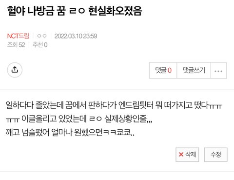 사실 예지몽느낌이라기 보단 데자뷰 오졌음 심지어 뜨자마자 판에서 올라온 떴다 글들까지도 똑같아서 ㄹㅇ 소름 돋음